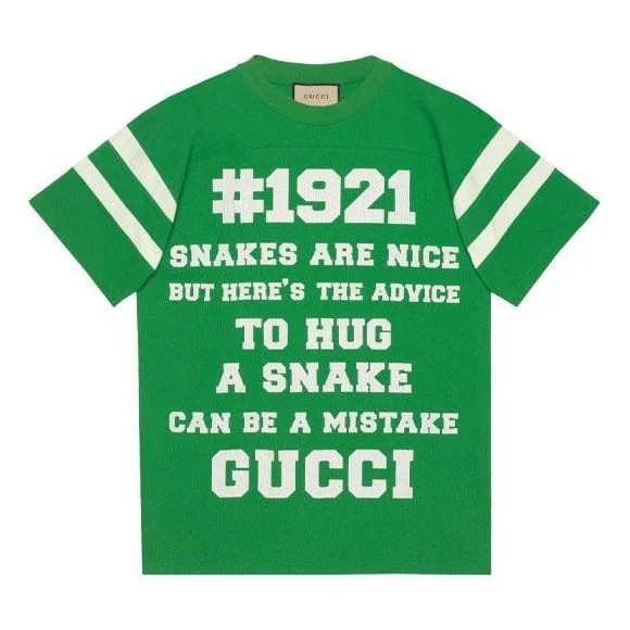 Prints inspired by endearing British nursery rhymes come together with various elements of the House for new interpretations of staple pieces. On the front of this green short-sleeve t-shirt, the year of Gucci’s founding accompanies the quote "Snakes Are Nice But Here’s The Advice to Hug a Snake Can Be a Mistake”. On the back, ‘Loved’ and 'Sin Amore Nihil’ play on the House’s romantic inspirations. - Green stone washed heavy cotton jersey with white Gucci 1921 "To Hug a Snake" and "Loved Sine Amore Nihil" prints - Contrast stripes at the sleeve - Crewneck - Made in Italy - The model is 6'1" tall. The product shown in this image is a size small