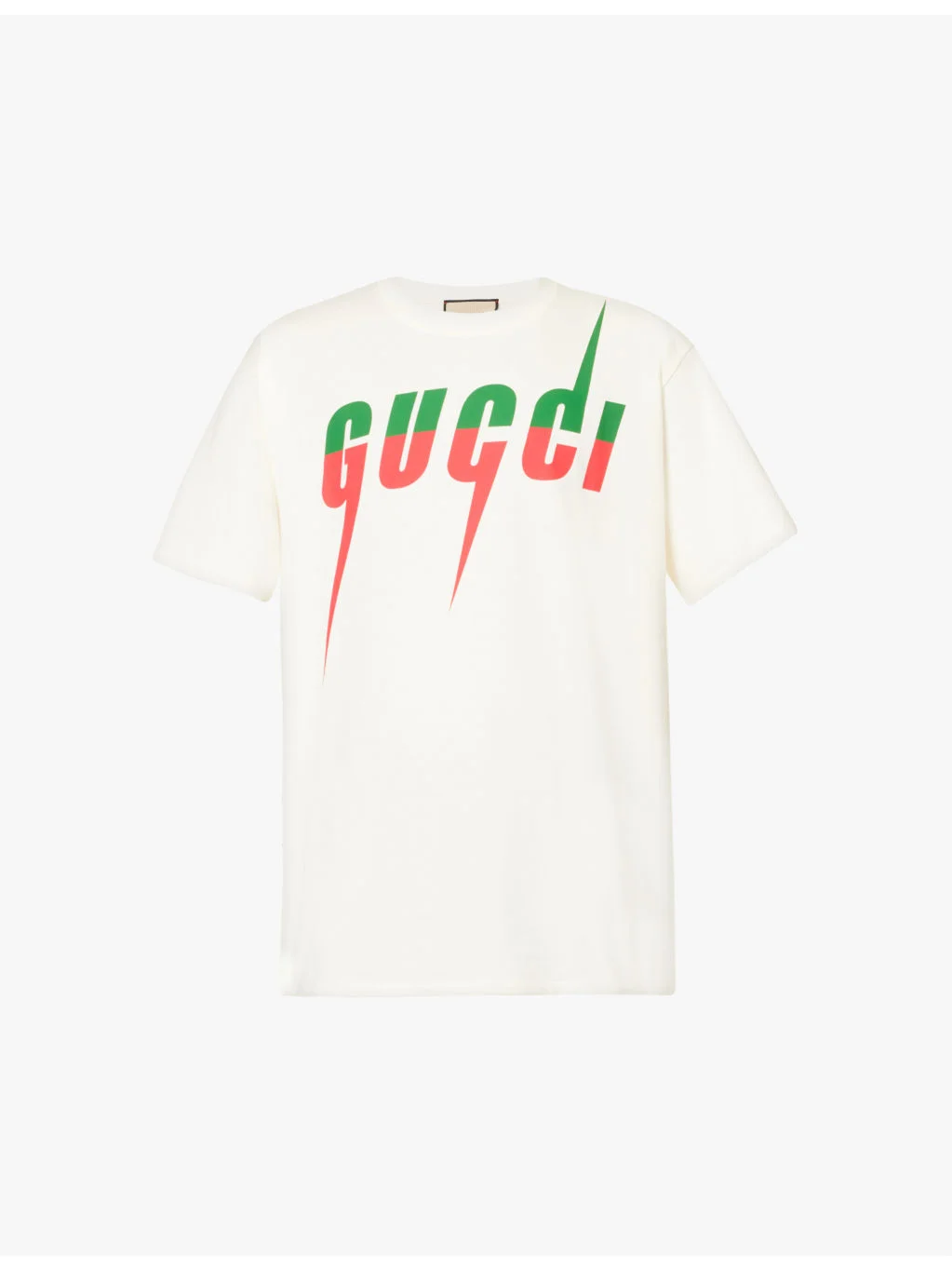 PRODUCT DETAILS - Gucci cotton-jersey T-shirt - 100% cotton - Pulls on - Relaxed fit, ribbed crew neck, short sleeves. brand print at front, straight hem - Hand wash - Made in Italy - Model is 6ft 2in/1.88m and wears a size medium - Lightweight, stretchy Ref: R04211327-S