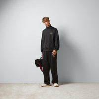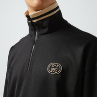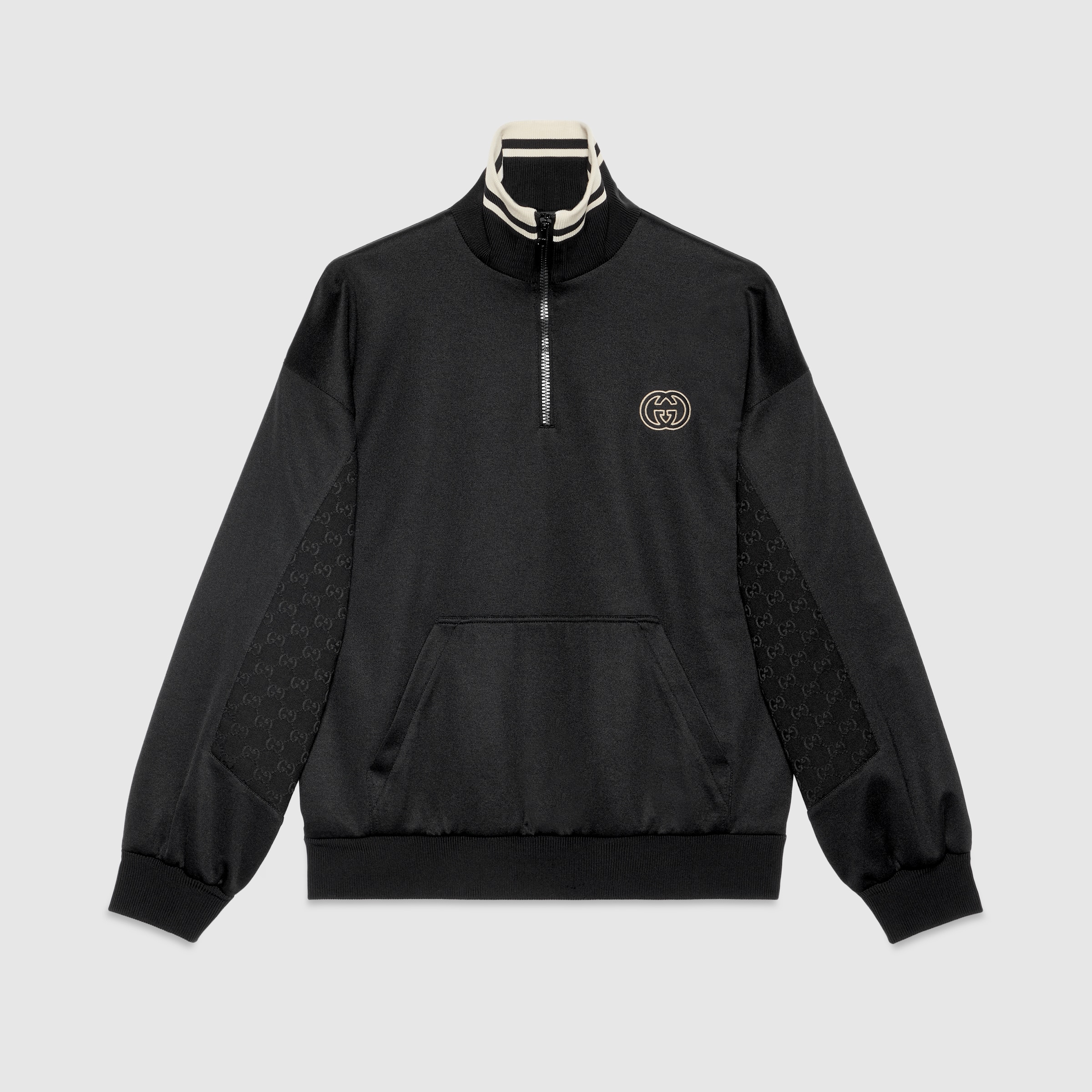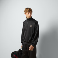 Welcoming warmer days, the men's Cruise 2024 collection presents sportier pieces with vibrant prints. The Web continues to lend an archival touch, while logo details take on bold modernity. Crafted from black technical jersey, this half zip jacket reveals an Interlocking G embroidered patch and tonal GG canvas inserts across the sleeves. - Black technical jersey - Interlocking G embroidered patch - High neck - Dropped shoulder - Long sleeves - Kangaroo pocket - Rib trim - GG canvas inserts - Back length: 26,3"; based on size M - Half zip closure - Over fit - Made in Italy - The product shown in this image is a size medium - Shoulder width: 24,4"; based on a size M