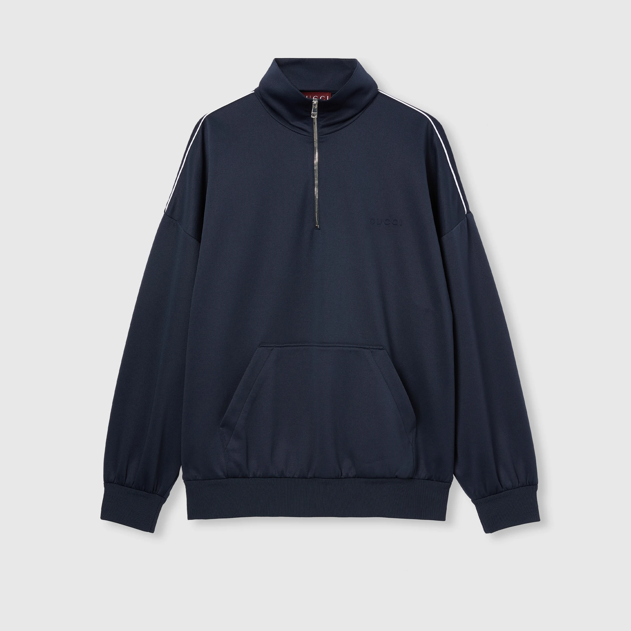 Maritime-inspired designs enrich casual silhouettes perfect for the seaside, featuring stripes, anchor motifs and the House logo in the Pre-Fall 2025 collection. Crafted from navy technical jersey, this sweatshirt is enriched with a contrast piping detail and an embossed Gucci logo. - Navy technical jersey - White piping trim - Embossed Gucci logo - Stand-up collar - Long sleeves - Kangaroo pocket - Front half zip closure - Made in Italy