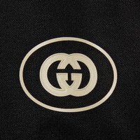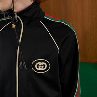 Mixing a black base with a contrast ribbon detail, this technical jersey zip jacket is imbued with a vintage, sportswear inspired feel and is defined by an easy silhouette. A sporty play on an emblematic logo, the Interlocking G patch enriches the style on the back pocket. - Black technical jersey - Interlocking G print - Ribbon detail - Long sleeves - Rib trims - Front zip pockets - Back length: 26,7"; based on size M - Front zip closure - Regular fit - Made in Italy - The product shown in this image is a size small