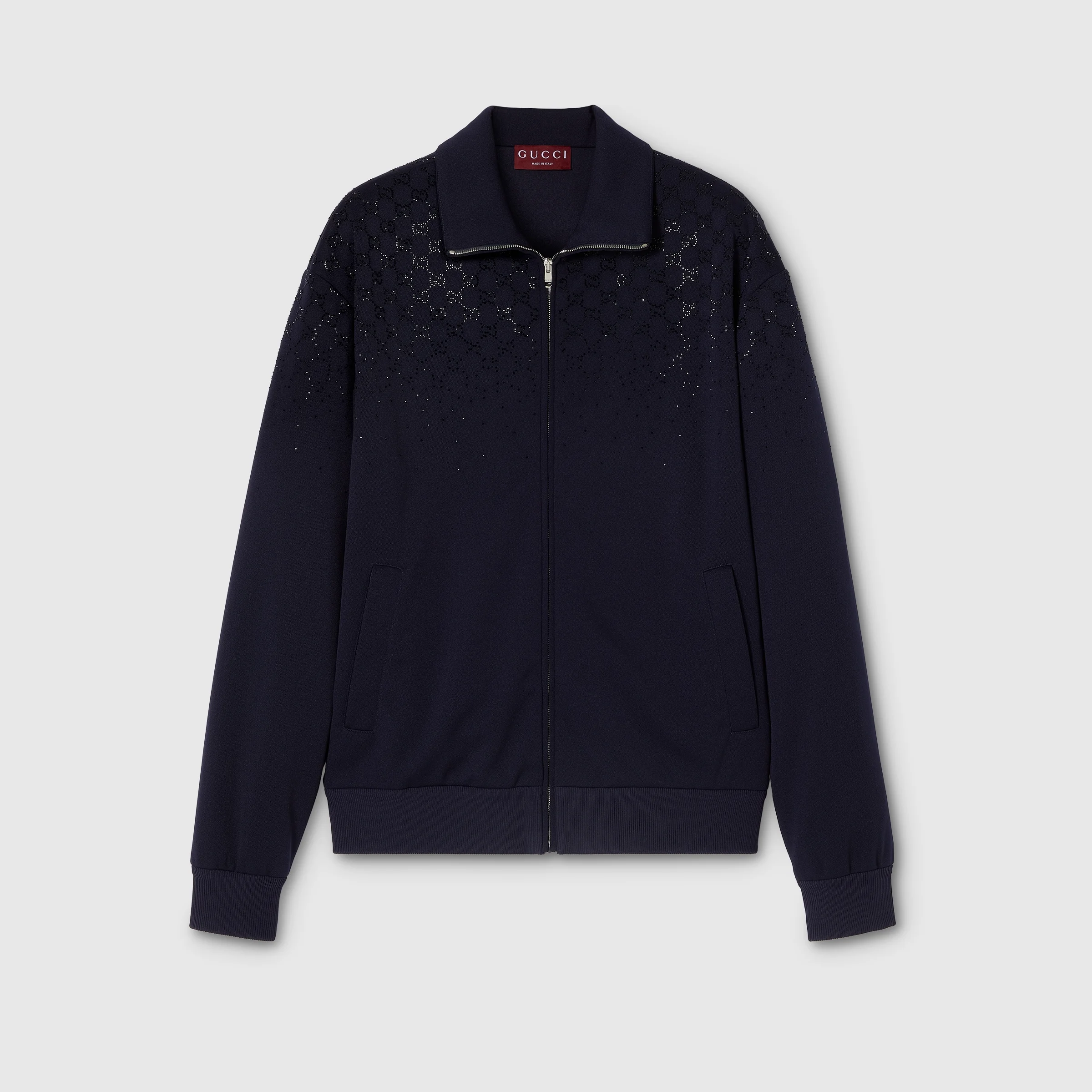 Gradient-effect crystal embroidery creates a sparkling contrast with the texture of emblematic fabrics of the House, such as the GG canvas, technical jersey, cotton jersey and cotton piquet. Crafted from dark blue technical jersey, this zip jacket is embellished with gradient GG crystals. - Dark blue technical jersey - Gradient GG crystals - Stand up collar - Front pockets - Long sleeves - Front zip closure - Length: 28.3", based on a size medium