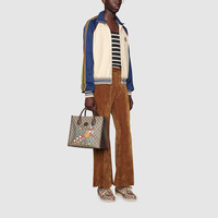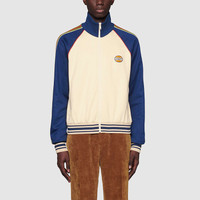 Inspired by retro sportswear, the zip-up jacket is presented in a bi-color technical jersey, with an ivory base and blue contrast sleeves. Reminiscent of logo tapes often found in vintage tracksuits, the green and red Web stripe runs down the sleeves. The design is further enhanced by a contrast piping and the House's emblem: the Interlocking G patch. - Ivory and blue technical jersey - Green and red Web stripe down the sleeves - Contrast piping - Interlocking G patch - Rib knit trims - Front pockets - Zip front - Made in Italy - The model is 6' and is wearing size small