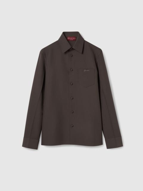In the Fall Winter 2025 collection, Gucci's classic codes meet a streamlined silhouette. This slim fit shirt is enriched by a metal Horsebit detail on the chest pocket. The style is completed by a concealed button closure, point collar and long sleeves. - Light grey technical panama - Point collar - Long sleeves - Chest pocket with Horsebit - Regular fit - Total length: 28.3"; Shoulder: 17.9"; Chest: 20"; Sleeve length: 25.9"; Neck width: 15.9" (size 46 IT)
