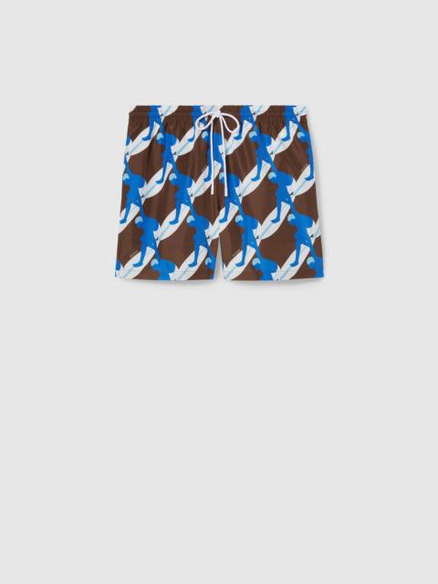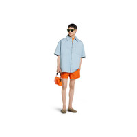 In the Spring Summer 2025 collection, technical poplin styles feature subtle logo details. This pair of swim shorts in bright orange technical poplin features a Gucci logo detail with an elastic waistband with drawstring. - Bright orange technical poplin - Gucci logo detail - Mesh lining - Elastic waistband with drawstring - Two side pockets - Back patch pocket - This item comes with a matching pouch - Please note that intimates, including swimwear, tights, socks and lingerie can only be returned in new condition. Items should be unworn, in their original packaging and with all labels attached. - Length: 15.4"; Waist: 16.3"; Hips: 21.7"; Hem width: 12.8"; based on a size 48 IT - Made in Italy - The product shown in this image is a size 48 (IT)