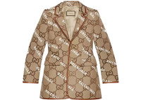 Exploring ideas of authenticity and appropriation within the fashion industry, Gucci Aria unveils The Hacker Project. In his latest collection, Alessandro Michele—in expressions of homage—infuses iconic Balenciaga silhouettes with Gucci codes in unique creations. This single-breasted jacket is reinterpreted in jumbo GG canvas and Balenciaga print. - Beige and ebony jumbo GG canvas and Balenciaga print - Leather details - The Hacker Project - Limited Edition: maximum of one style per purchase - Fully lined - Single-breasted - Notch lapel - Front pockets - Length: 76cm, based on a size 44 (IT) - Made in Italy - The model is 6' 1" tall. The product shown in this image is a size 44 (IT)