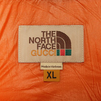This anorak jacket is part of The North Face x Gucci collection, a collaboration connecting two brands with similar history and values in celebration of the spirit of exploration. The pieces are characterized by a selection of bright colors and prints featuring The North Face x Gucci logo, flowers and woodland-inspired motifs. - Orange lightweight nylon with padding with The North Face x Gucci print on the front - The North Face x Gucci trail heat transfer on the back - The North Face x Gucci - Hooded with partial button closure - Front zip pocket - Tunnel tie details - Made in Vietnam - The model is 6' tall. The product shown in this image is a size XL