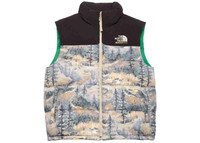 This down vest is part of The North Face x Gucci collection, a collaboration connecting two brands with similar history and values in celebration of the spirit of exploration. The pieces are characterized by a selection of bright colors and prints featuring The North Face x Gucci logo, flowers and woodland-inspired motifs. - Black lightweight nylon with The North Face x Gucci forest print lightweight nylon and down padding - The North Face x Gucci logo embroidery - The North Face x Gucci - Zip closure - Front pockets - Internal drawstring detail - Made in Vietnam - The model is 6'1" tall. The product shown in this image is a size XXL