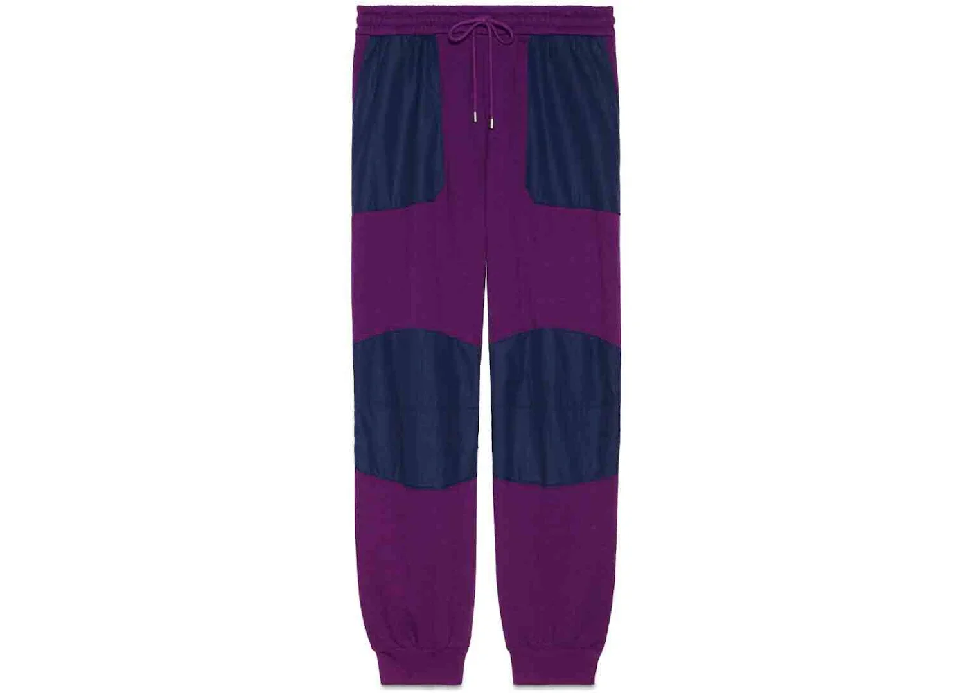 These jogging pants are part of The North Face x Gucci collection, a collaboration connecting two brands with similar history and values in celebration of the spirit of exploration. The pieces are characterized by a selection of bright colors and prints featuring The North Face x Gucci logo, flowers and woodland-inspired motifs. - Purple felted cotton jersey with blue nylon pockets and knees - The North Face x Gucci logo Web print - The North Face x Gucci - Internal waistband with adjustable tie - Front pockets - Single back pocket - Made in Italy