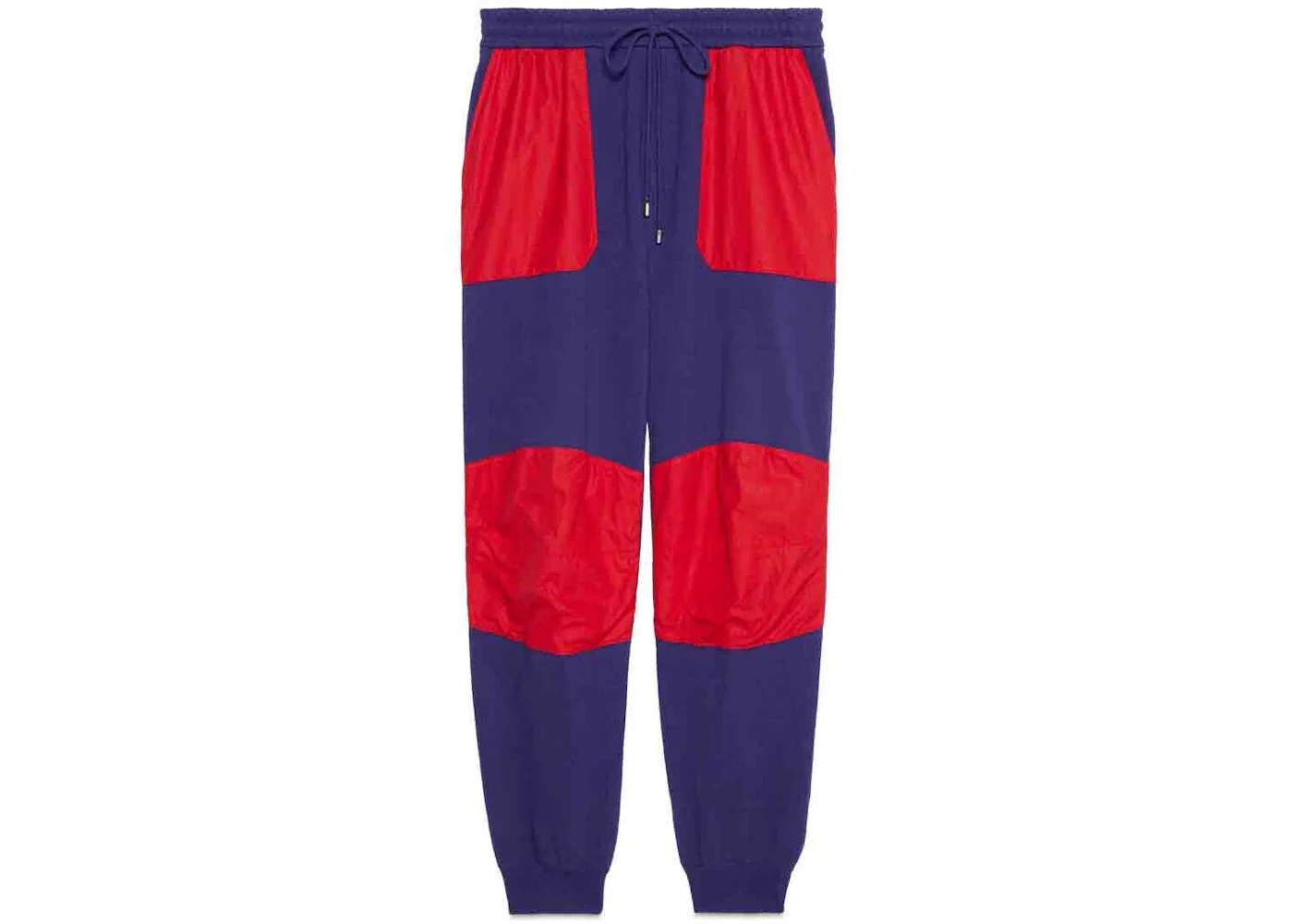 These jogging pants are part of The North Face x Gucci collection, a collaboration connecting two brands with similar history and values in celebration of the spirit of exploration. The pieces are characterized by a selection of bright colors and prints featuring The North Face x Gucci logo, flowers and woodland-inspired motifs. - Blue felted cotton jersey with red nylon pockets and knees - The North Face x Gucci logo Web print - The North Face x Gucci - Internal waistband with adjustable tie - Front pockets - Single back pocket - Made in Italy - The model is 6'1" tall.