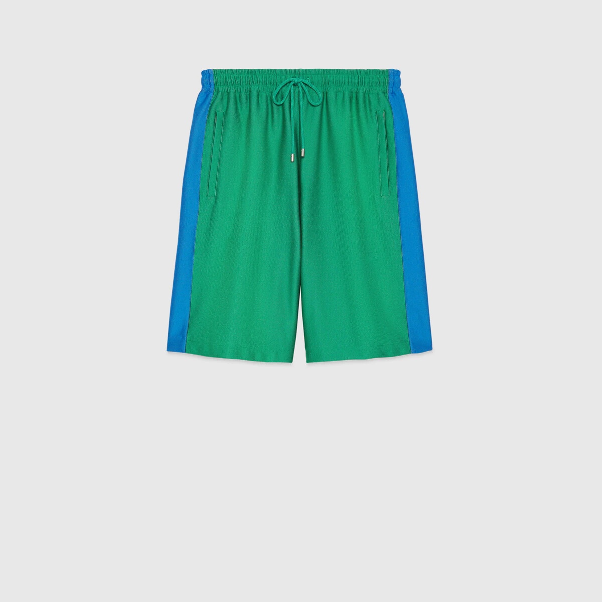 These shorts are part of The North Face x Gucci collection, a collaboration connecting two brands with similar history and values in celebration of the spirit of exploration. For this new chapter, the logo is presented in a multicolor variation. The North Face has a rich archive pushing innovation and breaking the rules in creating styles with unique and distinguishing design details. - Green nylon jersey jacquard - Blue and orange stripes down the legs - The North Face x Gucci - Multicolor The North Face x Gucci logo patch on the back - Elastic waistband with drawstring - Two on-seam zip pockets at the front and one patch pocket at the back - Made in Italy - The product shown in this image is a size small
