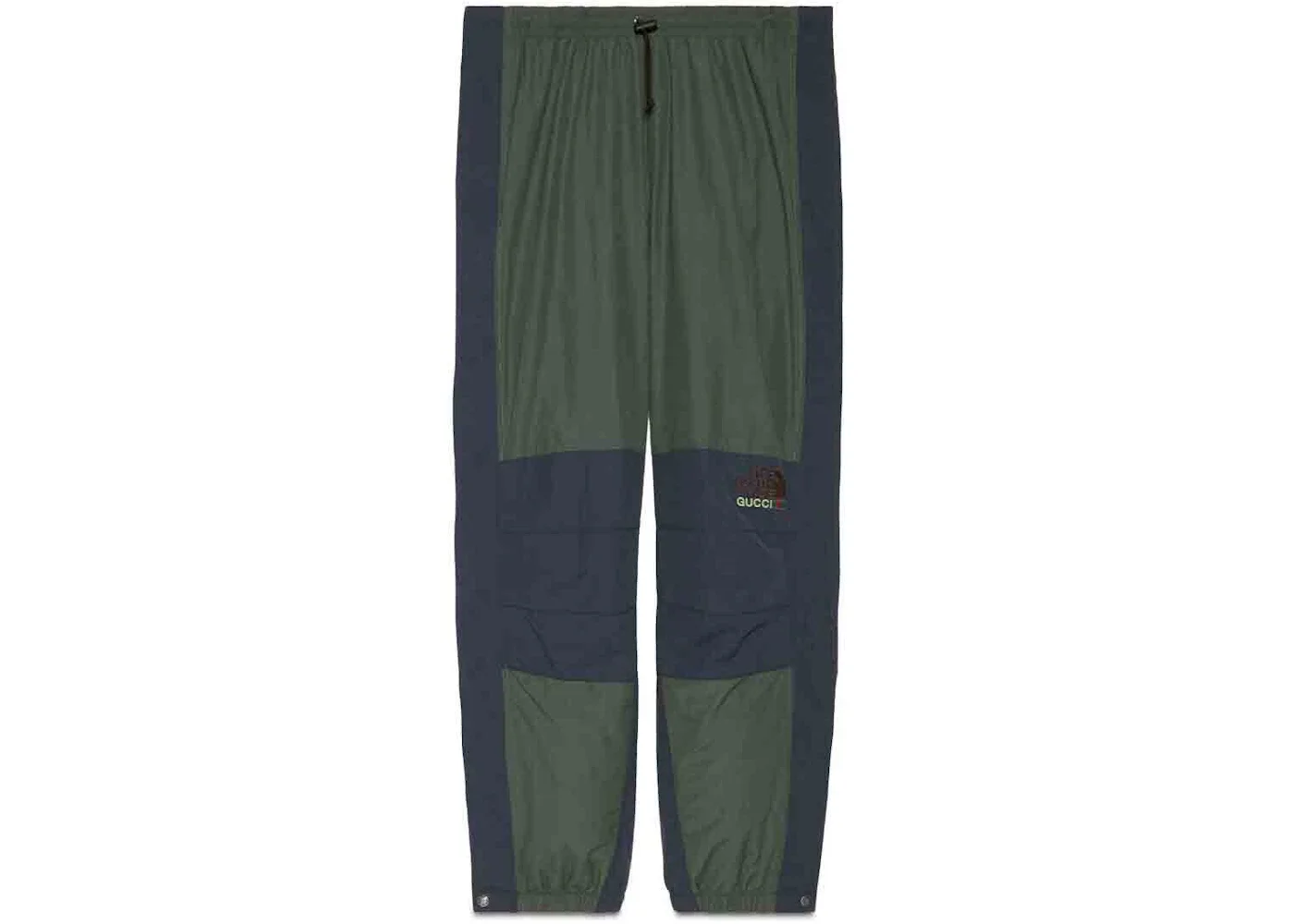 This technical cotton pant is part of The North Face x Gucci collection, a collaboration connecting two brands with similar history and values in celebration of the spirit of exploration. The pieces are characterized by a selection of bright colors and prints featuring The North Face x Gucci logo, flowers and woodland-inspired motifs. - Green and blue technical cotton - The North Face x Gucci logo embroidery - Lined - Elastic waistband - Elastic leg opening - Single back pocket - Made in Vietnam - The model is 6'1" tall. The product shown in this image is a size large