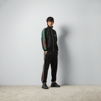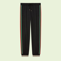 Mixing a black base with a contrast ribbon detail, these techincal jersey jogging pants are imbued with a vintage, sportswear inspired feel and is defined by an easy silhouette. A sporty play on an emblematic logo, the Interlocking G patch enriches the style on the back pocket. - Black technical jersey - Interlocking G print - Ribbon detail down the legs - Elastic waistband with drawstring closure - Striped cuffs - Front pockets - Back patch pockets - Leg length from the side: 39,3" based on a size M - Regular fit - Made in Italy - The product shown in this image is a size medium - Bottom hem width: 5,70" based on a size M