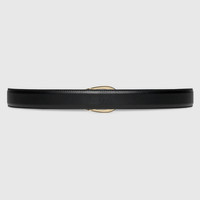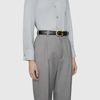 This thin leather belt is set with a G buckle with a shape reminiscent of Gucci designs from the seventies—a hallmark era of the House that continues to influence its narrative. - Black leather - Shiny gold-toned hardware - G buckle - 1.2" width - Made in Italy - Can be worn as a hip or waist belt. Sizing will differ based on where the belt is worn, please refer to the size guide to find your size.