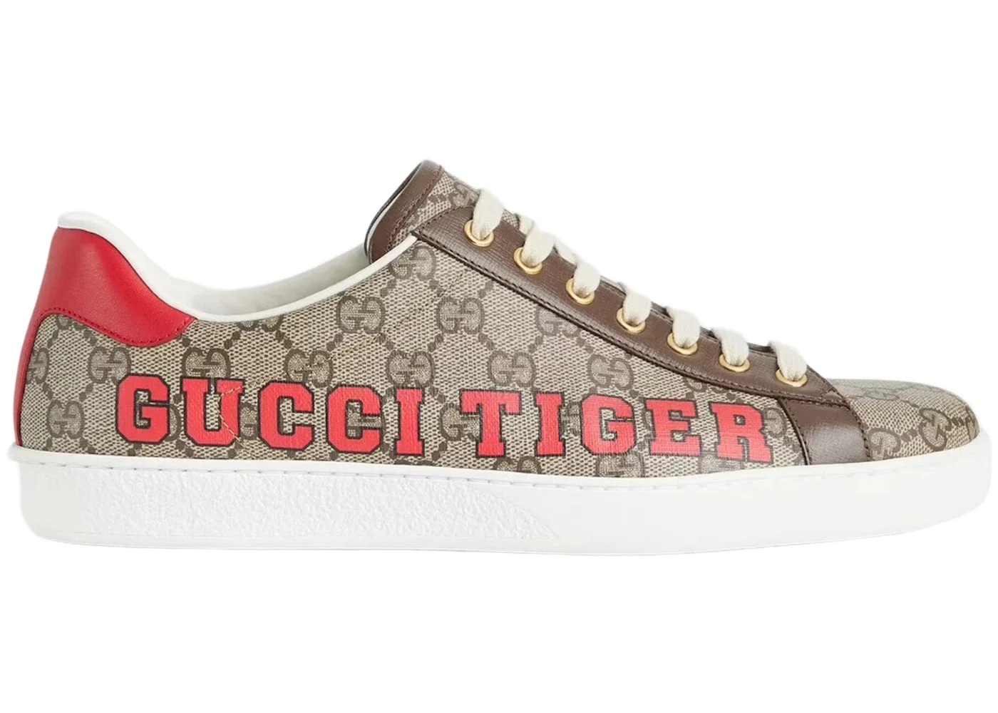 This pair of Ace sneakers is characterized by the printed motto 'Gucci Tiger.' References to the feline are often seen throughout the Creative Director's collections as an expression of the House's fascination with the wild beauty of the natural world. - Beige and ebony GG Supreme Canvas - Men's - 'Gucci Tiger' print - Brown leather detail - Red leather detail at the back - Rubber sole - Lace-up closure - Flat - .6" height - Made in Italy
