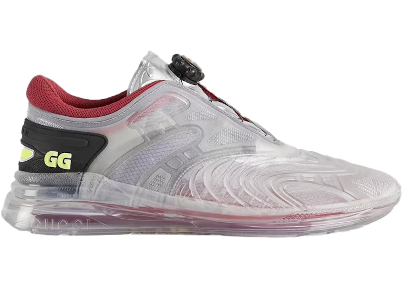 Borrowing inspiration from the world of running shoes, the Ultrapace sneaker line enters a new chapter with a futuristic evolution of the original design. Instead of laces, the shoes can be opened and closed by twisting a wire-dial closure featuring the Interlocking G logo. A hybrid style that combines details from different eras, the Ultrapace R is introduced for the Ouverture collection with a design that plays with colors and materials. - Transparent rubber with red knit fabric - This item uses men's sizing - Black and green rubber details - Rubber Double G - Gucci logo detail - Ultrapace R debossed at the back - Transparent sole - Rubber sole - Wire dial closure with Interlocking G - 1.2" height - Made in Italy