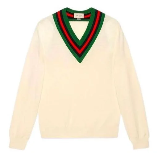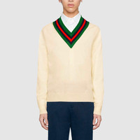 Crafted from white knit wool, the V-neck sweater features a green, blue and red trim profiling the neckline. The preppy influence, a style that can be traced back to the Ivy League schools in the Northeast United States, continues to characterize the Gucci narrative. - White knit wool - Green, blue and red trim - V-neck - Rib trims - Length: 25.5" based on a size small - Made in Italy - The model is 6'2" and is wearing size small