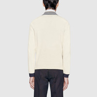 The bee is an archival code first introduced in Gucci ready-to-wear in the 1970s. Here, it is embroidered onto a V-neck wool knit. - White wool knit with blue stripes on the neckline and hem - Embroidered bee appliqué - V-neck - 100% wool - Made in Italy - The model is 6’2" and is wearing size medium