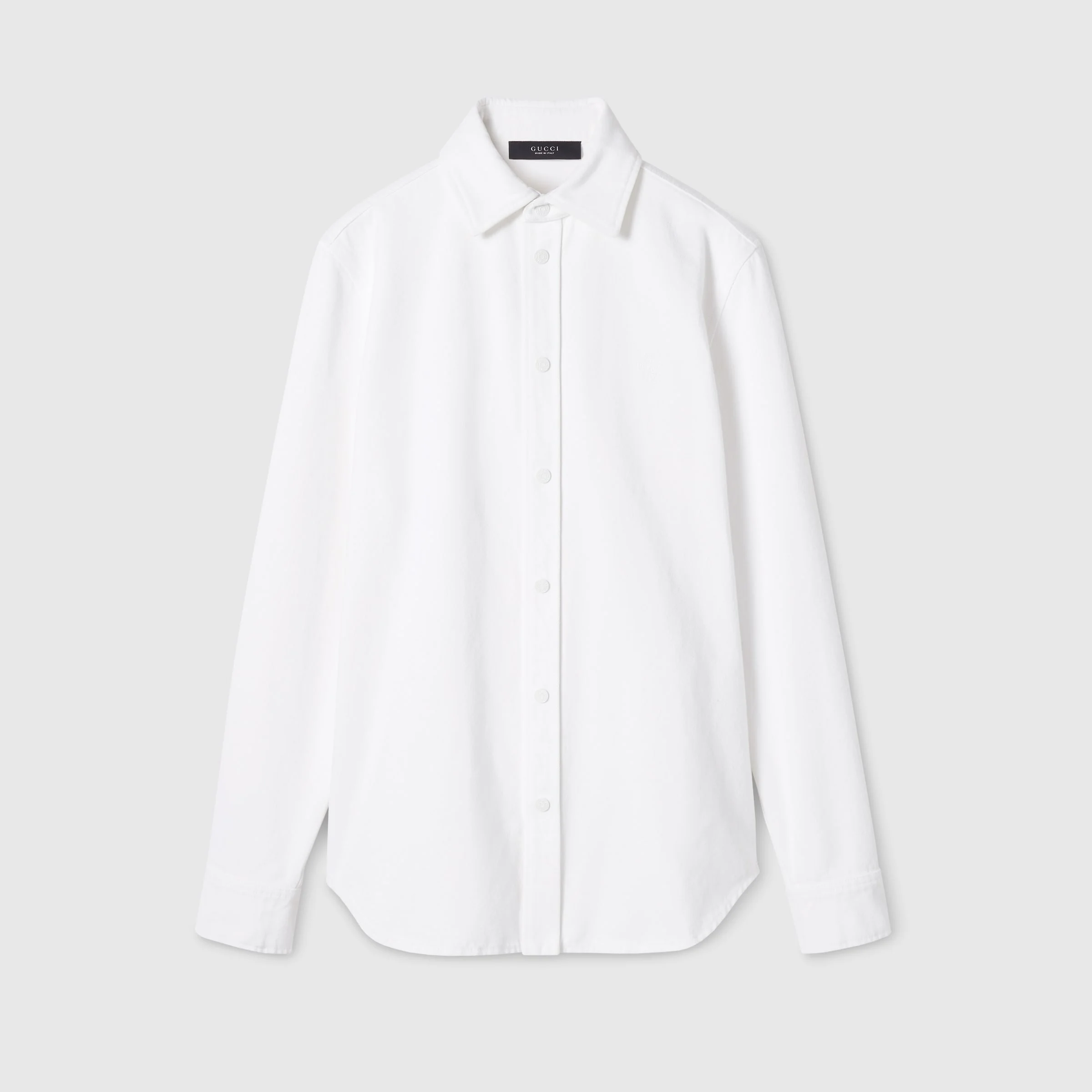 Introducing Spring Summer 2026. This style is part of the La Famiglia collection, which reinterprets the House’s codes through singular personalities and distinctive aesthetic attitudes. Crafted from washed certified cotton denim, this shirt is enriched with a Gucci crest embroidery. - White washed certified cotton denim - Gucci metal buttons - Gucci crest embroidery - Point collar - Long sleeves - Front snap button closure - Length: 31.1, based on a size 46(IT) - Made in Italy - Fabric: 100% Cotton - Embroidery: 100% Polyester