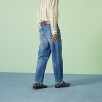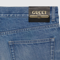 Blurring the line between formal and casual wear, new denim styles are presented in distinguished washes and textures, an integral part of the new tailoring concept. This pair of five-pocket style jeans is presented in blue denim. A Vintage Gucci logo label on the back defines the ready-to-wear piece. - Blue stone washed organic denim - Gucci koala embroidered patch - Belt loops - Five-pocket style - Vintage Gucci logo label at back - Raw cut edges - Button and zip closure - Leg opening: 7.5", based on a size 34 (IT) - Made in Italy - The product shown in this image is a size 34 (IT)