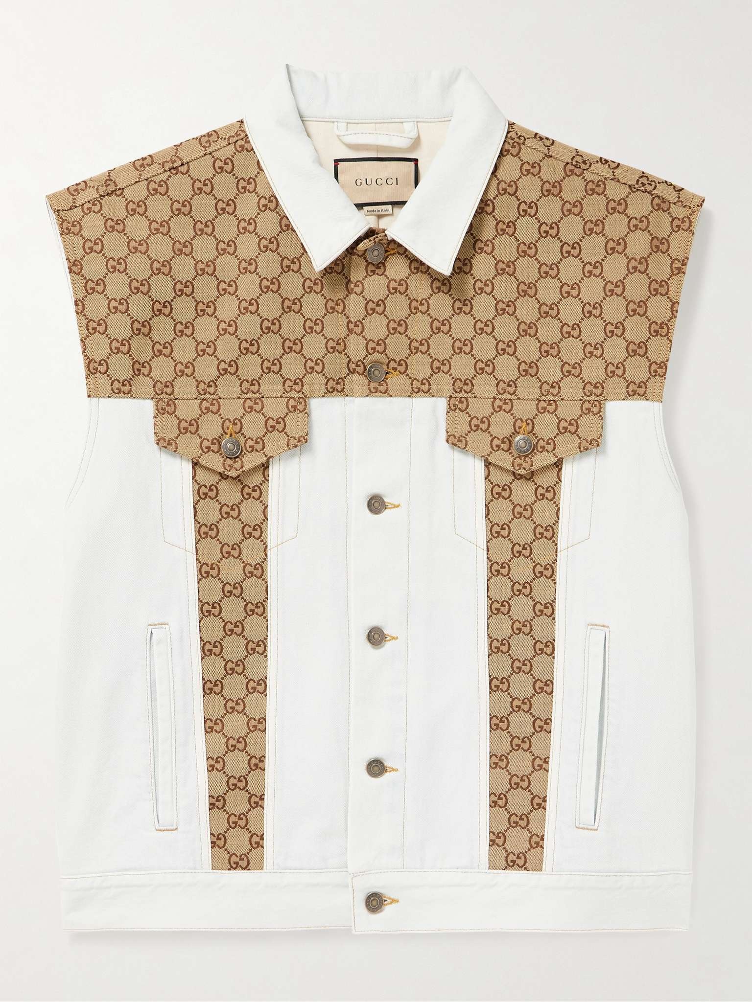 Gucci's 'rhombi' pattern was introduced in the 1930s and later evolved into the now iconic double 'G' monogram. Here, it's applied to a white denim trucker-style gilet in canvas patches. Wear yours with the matching jeans. Size & Fit - Model wears a size larger to achieve a looser fit - Mid-weight, non-stretchy fabric - Model is shown wearing an IT 48 - Model measures: chest 36"/ 92cm, height 6'3"/ 191cm Details & Care - White denim, beige and brown cotton-blend canvas - Button fastenings - Fabric1:100% cotton; fabric2: 70% cotton, 30% polyester; lining: 100% cotton - Dry clean