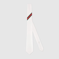 Introducing Spring Summer 2026. Silk and soft accessories designs continue to reinterpret emblematic codes through a creative lens in the La Famiglia collection, such as this tie with a Gucci Crest detail. - White Web silk jacquard - Gucci crest label - 2.75”W x 57.5”L - Made in Italy - Main fabric: silk 100%; lining: cupro 60%, silk 40%