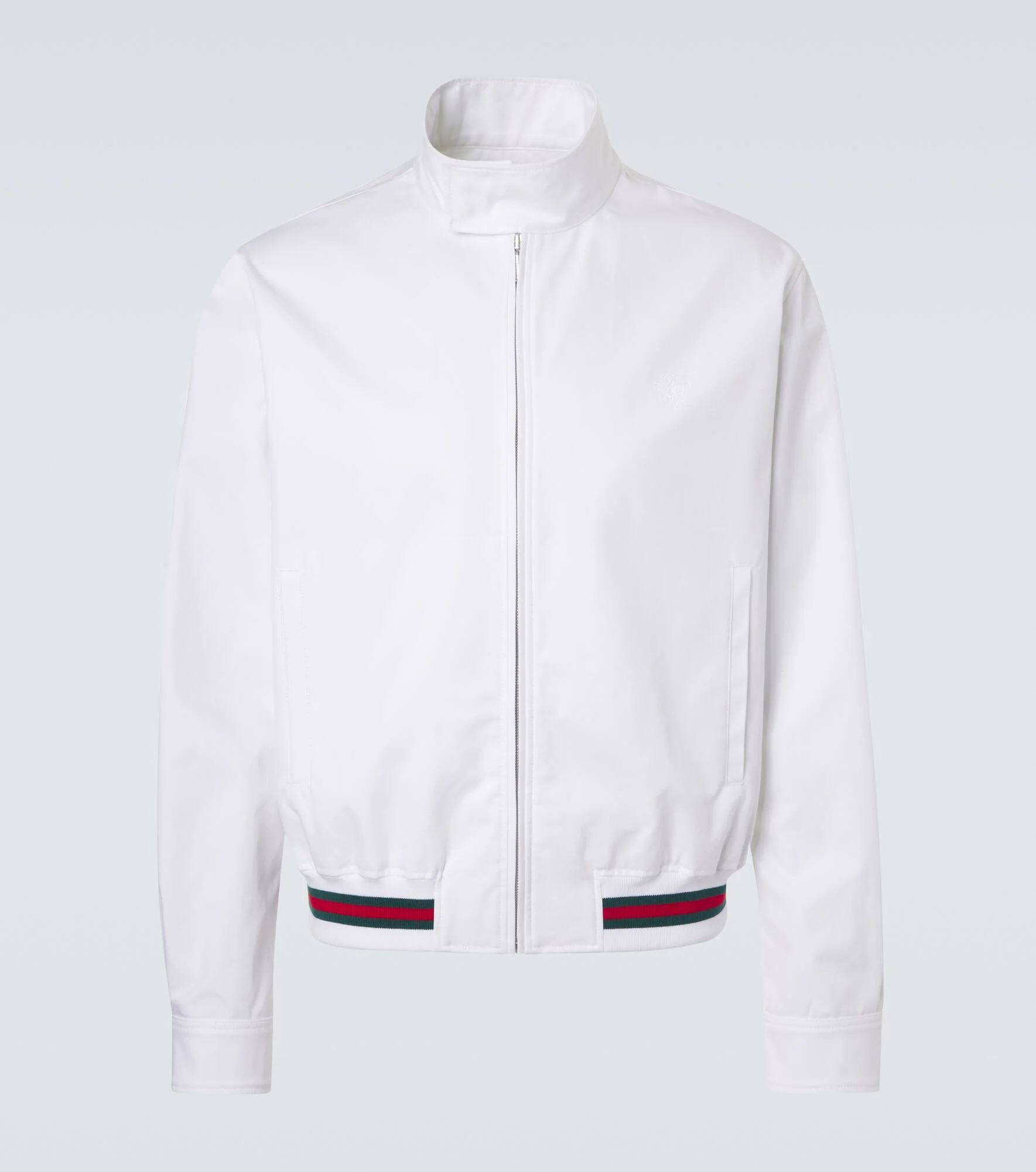 Part of Gucci's La Famiglia collection, this zip-up jacket showcases a cotton twill construction. The design stands out with signature accents, from the Web Stripe detail along the hem to the embroidered logo crest at the chest. Product Details - Material: 100% cotton - Care instructions: dry clean - Made in Italy - Color: white - Designer color name: White - Embroidery: 100% polyester - Trim: 78% cotton, 17% wool, 5% elastane - Lining: 100% cotton - Snap-buttoned cuffs - Pockets: welt pockets - Closure: concealed zipped front - Item number: P01151310 Size & Fit - True to size - Straight fit - Elasticated hem - Non-stretchy fabric - Falls to the hip - Height of model is 189cm-74.5" and wears a size IT 50