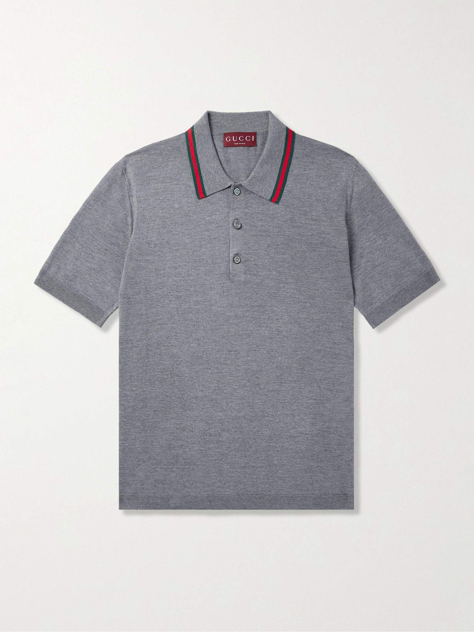 The collar of Gucci's polo shirt is traced with signature red and green stripes, lending it a retro, sporty appeal. It's been knitted in Italy from lightweight wool and fastens with matching mother-of-pearl buttons. Wear yours with the label's denim and tailoring alike. Size & Fit - Fits true to size. Take your normal size - Designed for a regular fit - Lightweight, stretchy fabric - Model is shown wearing a M - Model measures: chest 38"/ 96cm, height 6'0"/ 183cm Details & Care - Grey melange, red and green wool - Button fastenings - 100% wool - Dry clean - Mother-of-pearl: Australia