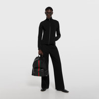 Introducing Spring Summer 2026. New soft leather designs combine functional versatility and multiple wearabilities. The revisited Web intarsia detail further elevates the style. - Black soft leather - Silver-toned hardware - Black canvas lining with Diamante motif - Adjustable padded shoulder straps - Padded mesh back - Web intarsia and "Gucci Made in Italy" logo - Inside: 1 zip pocket - Outside: 1 zip pocket - Zip closure - 14.3"W x 16.1"H x 7"D - Weight: 3.3lbs, approximately - Made in Italy - Fits up to a 13" laptop, iPad, A4 notebook, and small items