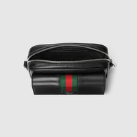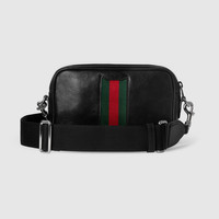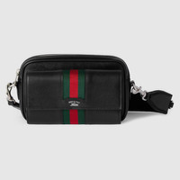 Introducing Spring Summer 2026. The focus on refined leather is highlighted through new soft small leather goods. This style combines functional versatility and the revisited Web detail which further elevates the design. - Black soft leather - Silver-toned hardware - Black canvas lining with Diamante motif - Web intarsia and "Gucci Made in Italy" logo - D-ring for additional items - Inside: 2 card slots - Outside: 1 pocket with snap button closure - Adjustable and detachable nylon strap with 21.6" drop - Zip closure - 7.8"W x 4.7"H x 3.5"D - Weight: 1.1lbs, approximately - Made in Italy - Fits iPhone, Airpods and small items