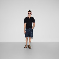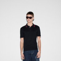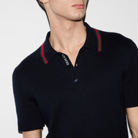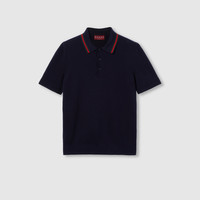 Gucci's House codes continue to evolve for the new season across jersey pieces. This polo shirt is presented in a silk cotton knit and enriched with a green and red Web trim and Gucci intarsia. - Navy silk cotton knit - Green and red Web trim - Gucci intarsia - Polo collar - Dropped shoulder - Short sleeves - Rib trim - Button closure - Length: 26.2"; Shoulder: 17.7"; Chest: 20.9"; Sleeves length: 9.8"; based on a size M - Made in Italy - The product shown in this image is a size medium