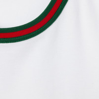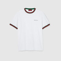 The House continues to explore its connection to the world of tennis that began in the 1970s. Signature pieces focus on heritage details like the Web stripe, as well as innovative materials. This T-shirt in white cotton jersey is decorated with a Gucci embroidery and finished with a Web trim. - White cotton jersey - Web trim - Gucci embroidery - Crewneck - Short sleeves - Made in Italy