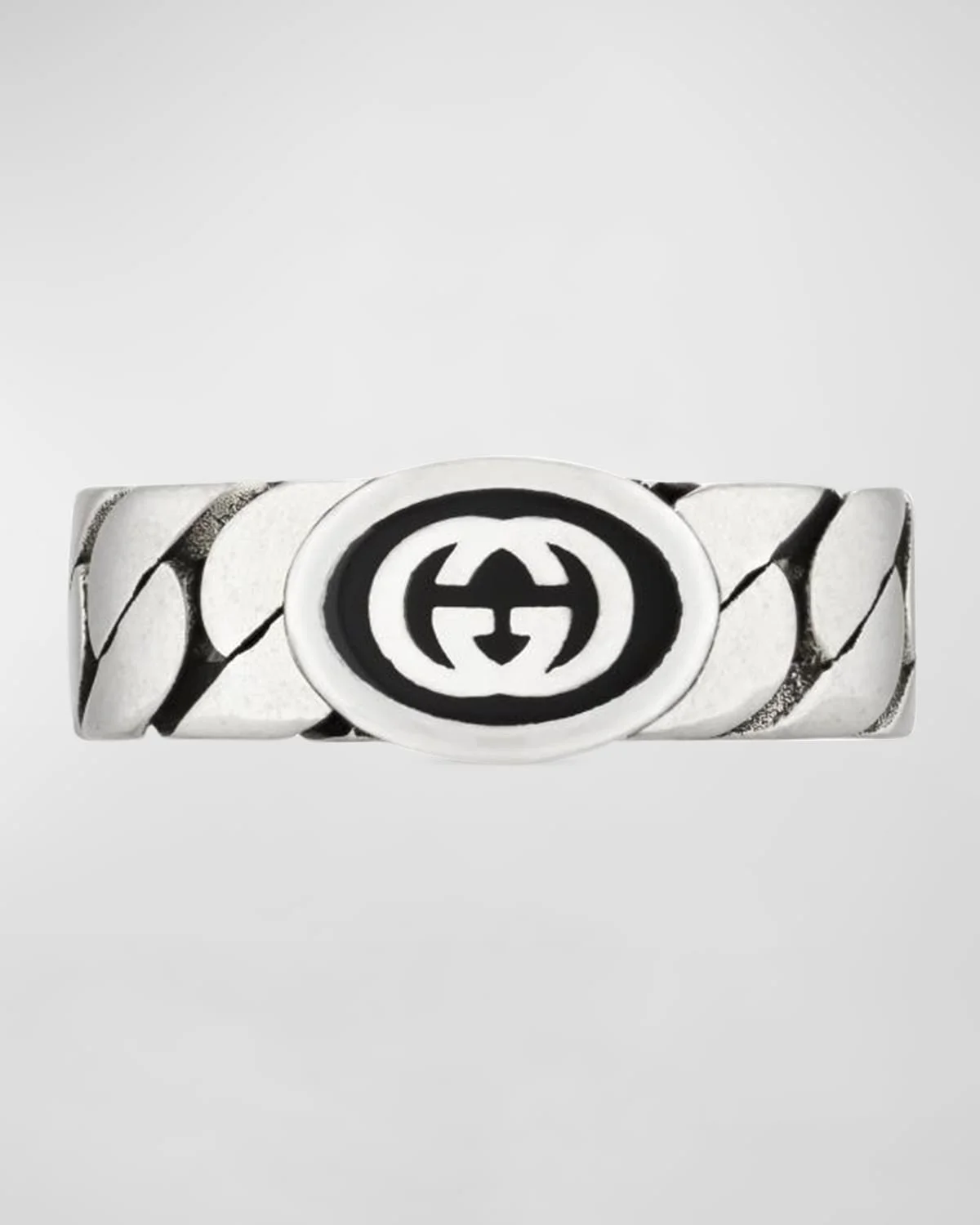 - Gucci ring crafted with a wide gourmette chain construction from the gucci aria collection - Featuring enameled interlocking G-monogram - Approx. .2" band width - 925 sterling silver - Made in Italy