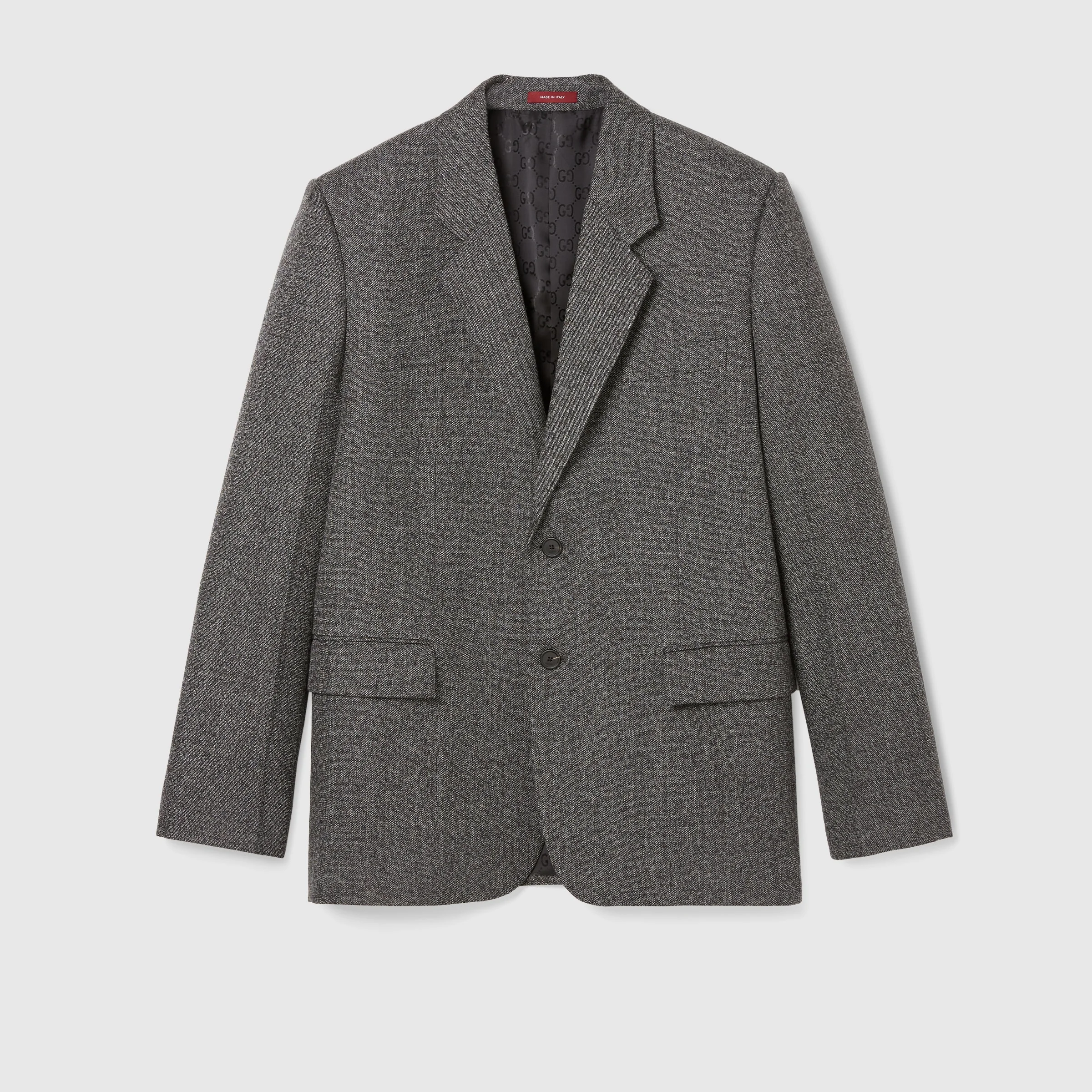 In the Fall Winter 2025 collection, essential lines define the silhouette through refined fabrics and classic British tailoring codes. This single-breasted jacket features a notch lapel, flap pockets and a chest welt pocket. Fully lined, the style is constructed with a full canvas for elevated structure. - Grey and black wool mouline - Fully lined - Notch lapel - Single-breasted - Full canvas construction - One chest welt pocket - Two front flap pockets - Regular fit - Total length: 29.5"; Shoulder: 17.7"; Chest: 20.8"; Sleeve length: 25.9"; (size 46 IT)