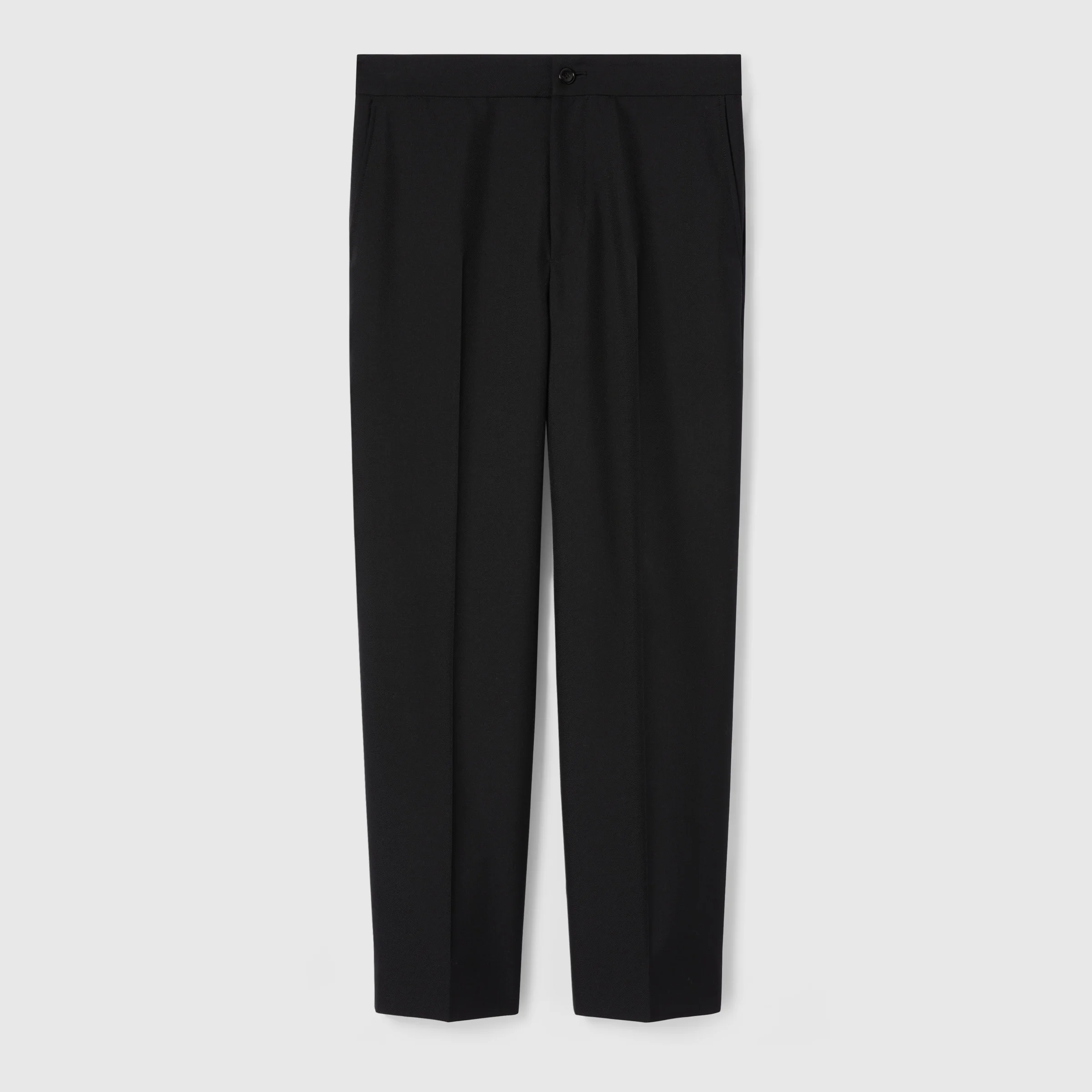 Pre-Fall 2025 pieces in muted black, grey and green tones spotlight delicate floral embroideries, embossed logos, and more craftsmanship details. Crafted from black wool blend twill, this pair of pants is completed with a Gucci metal lettering detail. - Black wool blend twill - Gucci metal lettering - Internal drawstring - Side pockets - Back pockets - Front zip and button closure - Made in Italy