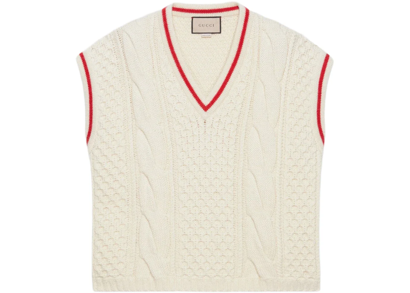 A chunky cable knit oversize cardigan has bold stripes in colors that are reminiscent of the Web. The preppy influence, a style that can be traced back to the Ivy League schools in the Northeast United States, continues to characterize the Gucci narrative. - Ivory wool cable knit - V-neck - Length: 60cm, based on a size medium - Made in Italy - The model is 6' 1" tall. The product shown in this image is a size medium