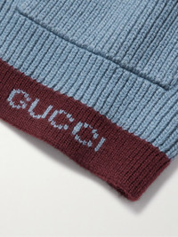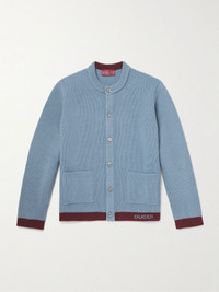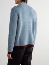 Two-Tone Logo-Jacquard Ribbed Wool Cardigan Blue