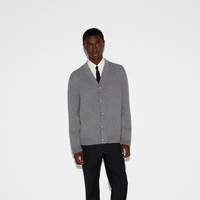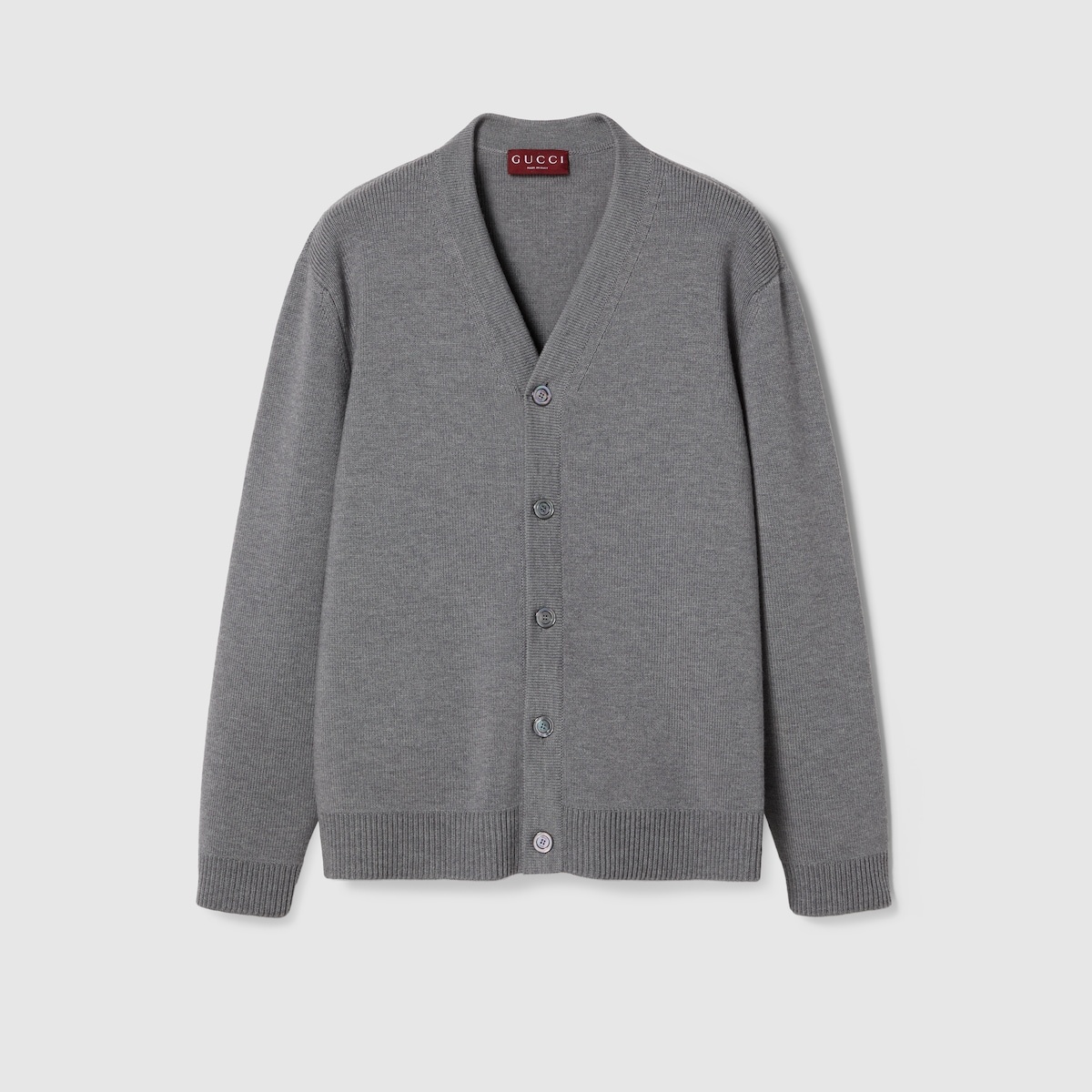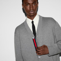 Pre-Fall 2024 spotlights essential silhouettes with emblematic details, presenting a modern take on sophisticated materials. This cardigan with a regular fit is crafted from grey wool and reveals a blue and red Web intarsia inside the front placket. - Grey and multicolor stitch wool - Blue and red Web intarsia - V-neck - Slightly drop shoulder - Long sleeves - Rib trim - Shoulder drop: 18.8"; based on a size a medium - Chest: 21.2"; based on a size medium - Sleeves length: 24.8"; based on a size medium - Button closure - Cut for a regular fit - Length: 27.5"; based on a size medium - Made in Italy - The product in the image is a size medium