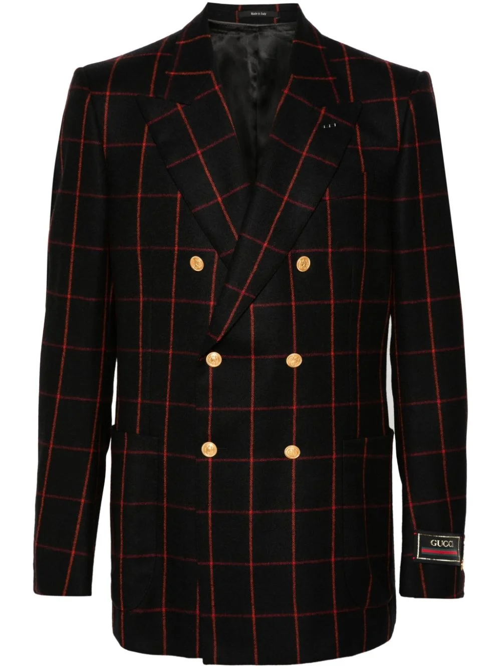 logo-patch blazer Highlights - Black/red - Wool - Twill weave - Logo patch at the sleeve - Double-breasted button fastening - Check pattern - Peak lapels - Chest welt pocket - Two front patch pockets - Long sleeves - Buttoned cuffs - Central rear vent - Full lining - Internal slip pocket - Straight hem Made in Italy Composition Outer: Wool 100%, Polyester 80%, Metallic Fibre 20% Lining: Cupro 100% SIZE & FIT Model measurements Height 6 ft 2 in(1.87 m) Bust/Chest 38.18 in(97 cm) Hips 36.61 in(93 cm) Waist 29.13 in(74 cm) FittingInformation Designed for a slim fit, offering a comfortable fit that sits just away from the body The vented hem offers movement at the rear Made from a midweight non-stretch fabric This piece fits true to size – take your usual size Washing instructions Dry Clean Only