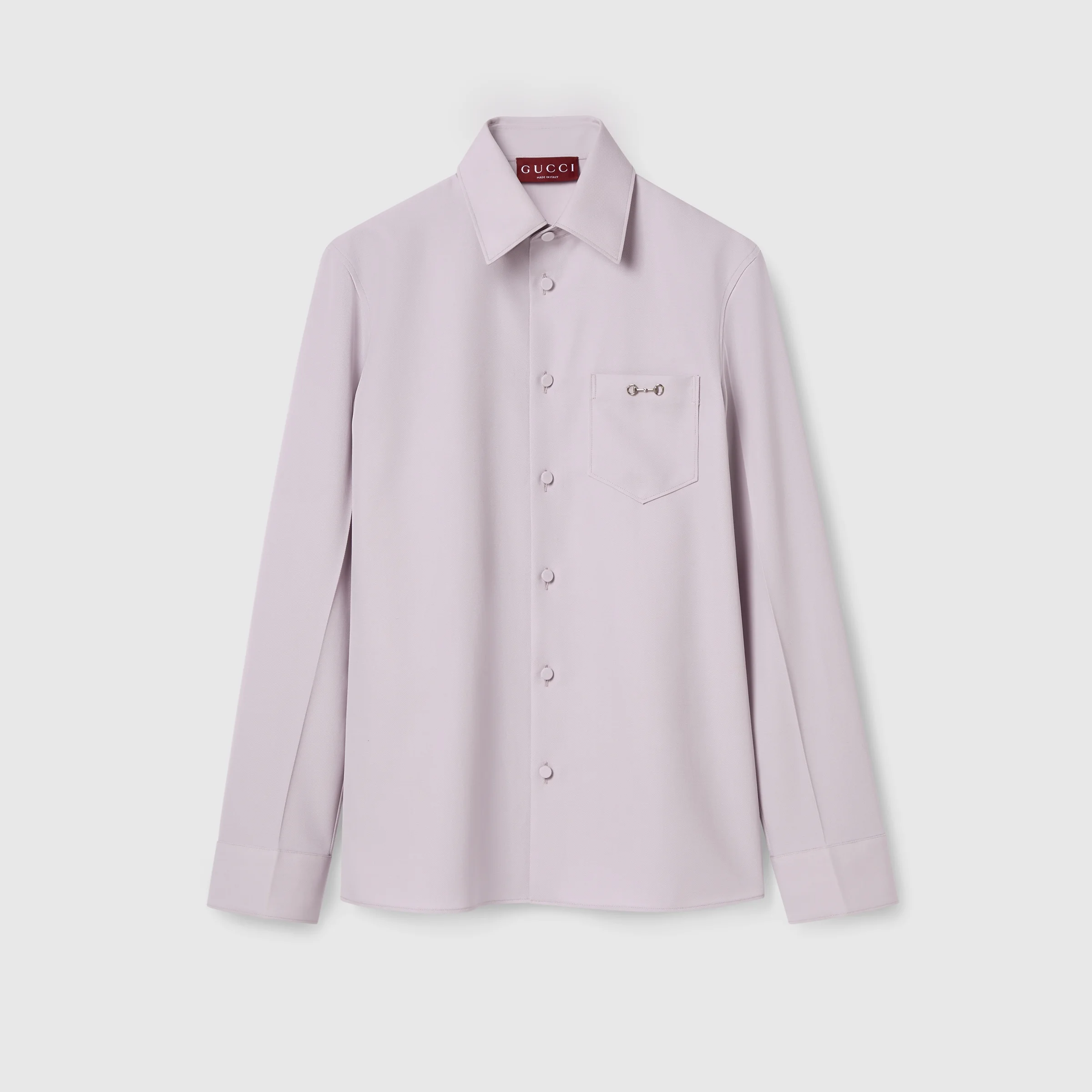 In the Fall Winter 2025 collection, Gucci's classic codes meet a streamlined silhouette. This slim fit shirt is enriched by a metal Horsebit detail on the chest pocket. The style is completed by a concealed button closure, point collar and long sleeves. - Pastel lilac wool gabardine - Point collar - Long sleeves - Chest pocket with Horsebit - Regular fit - Total length: 28.3"; Shoulder: 17.9"; Chest: 20"; Sleeve length: 25.9"; Neck width: 15.9" (size 46 IT)