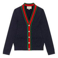 Crafted from dark blue knit wool, this cardigan features a green, blue and red trim running down the neckline and closure. The preppy influence, a style that can be traced back to the Ivy League schools in the Northeast United States, continues to characterize the Gucci narrative. - Dark blue knit wool - Green, blue and red trim along the closure - Rib trims - Front pockets - Mother of pearl buttons - Length: 26" based on a size small - Made in Italy - The model is 6'2" and is wearing size small