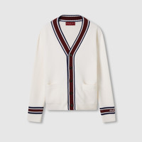 Classics such as soft knitwear and polo shirts throughout the Cruise 2025 collection stand out with subtle details that elevate everyday looks. This soft V-neck cardigan has been made from a wool knit and reveals a Gucci intarsia. - White wool knit - Gucci intarsia - V-neck - Dropped shoulder - Long sleeves - Two front pockets - Stripe detail - Rib trim - Button closure - Length: 26.3"; based on a size S - Made in Italy - The product shown in this image is a size small