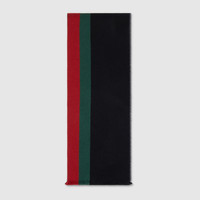 The House's silk accessories collection continues to reinterpret emblematic motifs, from the GG, Web, Flora, bamboo, Horsebit and equestrian inspirations, in sumptuous materials, intricate craftsmanship, and fresh hues. This wool scarf reveals a green and red Web detail and a fringe trim. - Black wool - Fringe trim - Web detail - 13.3"W x 74.8"L - Main fabric: wool 96%, silk 4%