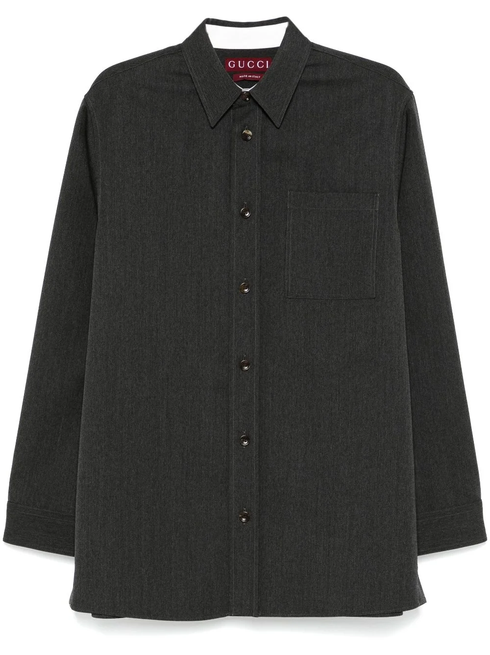 wool shirt Highlights - Anthracite grey - Wool - Twill weave - Front button fastening - Classic collar - Long sleeves - Buttoned cuffs - Chest patch pocket - Side slits - Logo trim - Straight hem Made in Italy Composition Wool 100%, Polyester 100% SIZE & FIT Model measurements Height 6 ft 2 in(1.87 m) Bust/Chest 35.82 in(91 cm) Hips 35.82 in(91 cm) Waist 31.88 in(81 cm) FittingInformation Designed to be unstructured, offering a loose fit throughout Made from a midweight non-stretch fabric