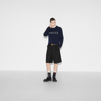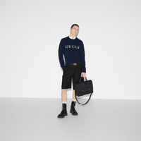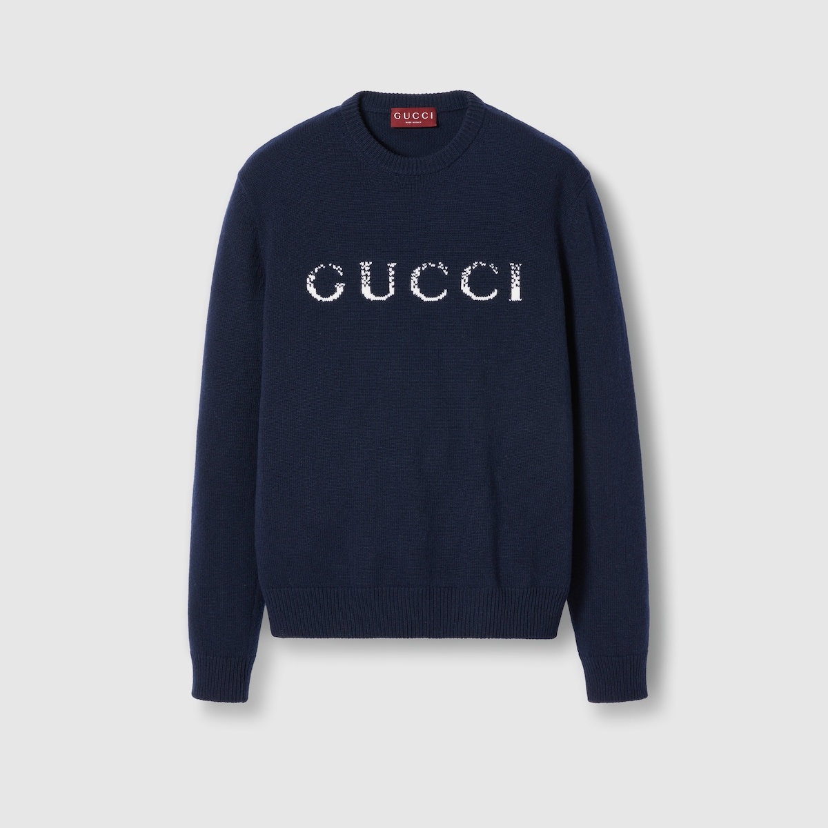 Transitioning into the warm season, new sets bring to mind a sartorial uniform enriched with subtle yet refined details, in cotton or jersey, in logo-detailed outerwear or knitwear. Crafted from dark blue knit wool, this regular fit sweater is defined by a contrasting Gucci intarsia. - Dark blue knit wool - Gucci intarsia - Crewneck - Dropped shoulder - Rib trim - Shoulder drop: 17.3"; based on a size M - Chest: 21.2"; based on a size M - Sleeves length: 25.9"; based on a size M - Regular fit - Length: 26.3"; based on a size M - Made in Italy - The product shown in this image is a size medium