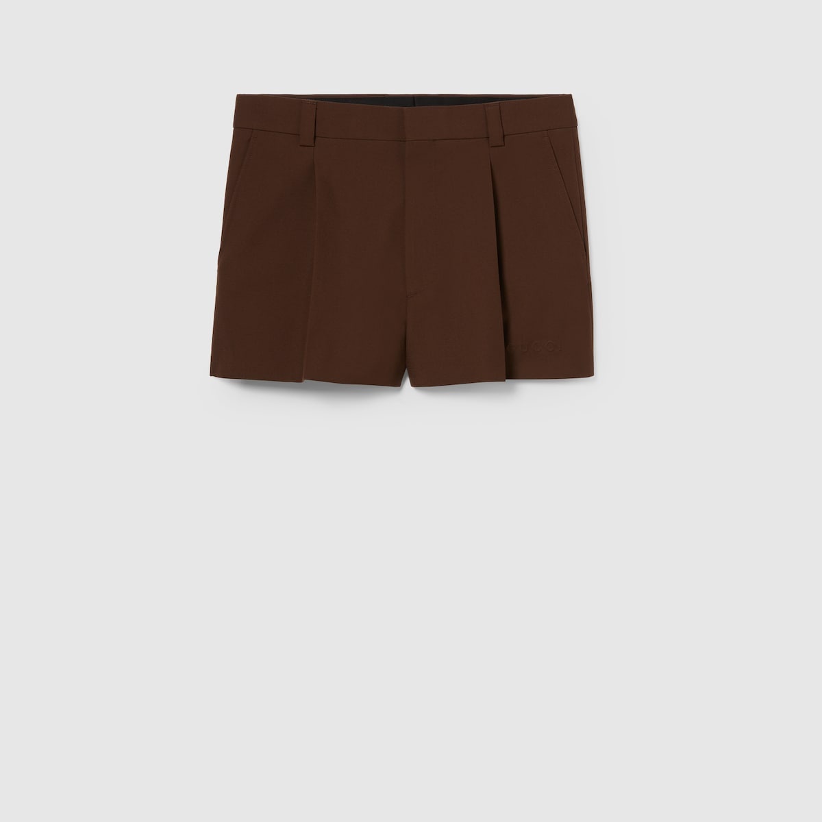 In the Spring Summer 2025 collection, sartorial pieces are lent a casual feel with subtle logo details. This pair of dark brown shorts in refined wool twill features pleats on the front and an embossed Gucci logo. - Dark brown wool twill - Embossed Gucci logo - Pleats on the front - Length: 14.4" - Leg opening: 13.6" - Made in Italy