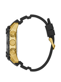 multi-functional 52mm watch Highlights - Black dial - Quartz movement - Round case shape - Gold-tone dial numerals - Three chronograph sub-dials - Three screw-in crowns - Water resistance up to 50m - This item comes with a standard one-year warranty from the boutique. Imported Composition Silicone 100%, stainless steel 100%