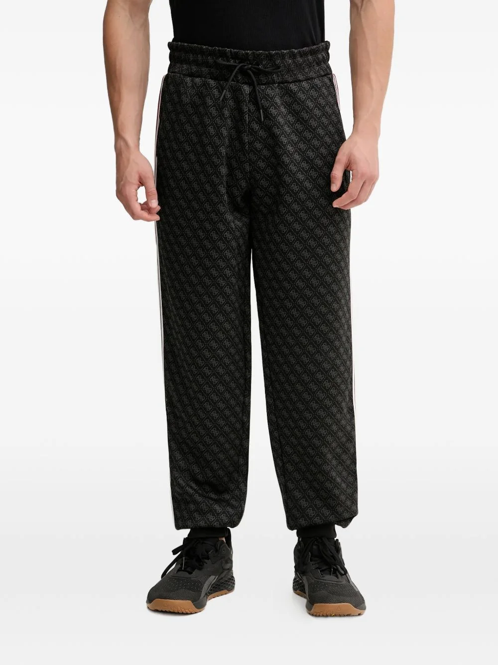 pattern side stripe track pants Highlights - Black grey - All-over pattern - Side stripe detail - Elasticated drawstring waistband - Seam detail Imported Composition Fabric 100% Washing instructions Read Manufacturer Guidelines
