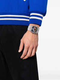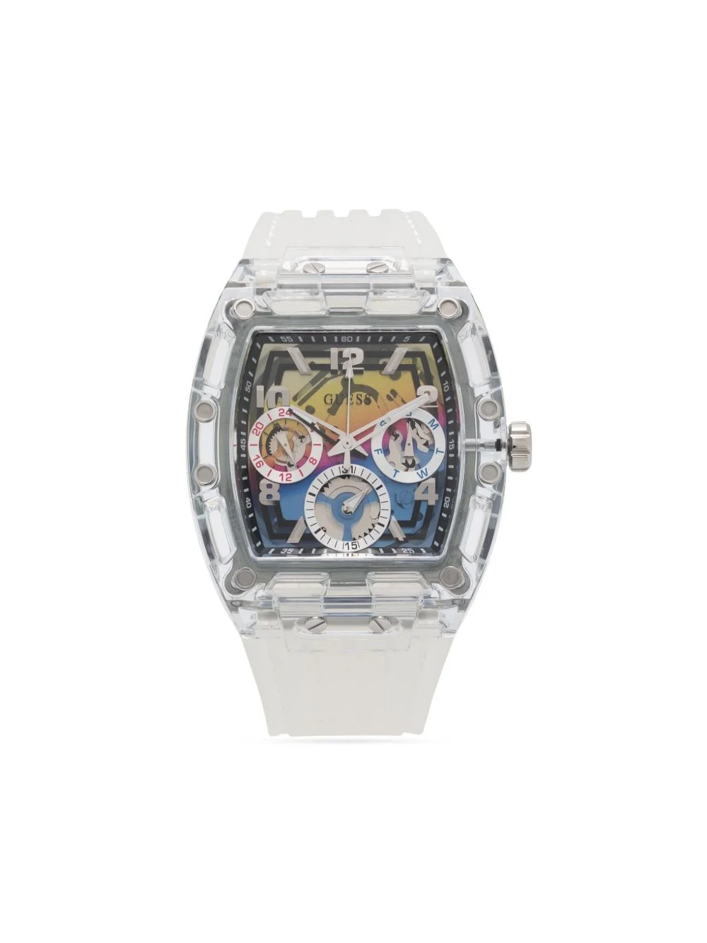 Phoenix 41.5mm Highlights - 41.5mm - Silver-tone - Skeleton dial - Stainless steel/polycarbonate - Arabic dial - Index hands - Transparent design - Screw-down crown - Silicone strap - Pin-buckle fastening - Water resistance up to 50m/5 atm - Gutm2 movement Imported Composition Silicone 100%, glass 100%, stainless steel 100% SIZE & FIT Model measurements Height 6 ft 1 in(1.86 m) Bust/Chest 37.4 in(95 cm) Hips 36.22 in(92 cm) Waist 29.52 in(75 cm) Measurement DIAMETER 1.77 in(4.5 cm) Minimum Length 6.29 in(16 cm) Thickness 0.51 in(1.3 cm) TOTAL LENGTH 8.26 in(21 cm) WIDTH 1.14 in(2.9 cm)