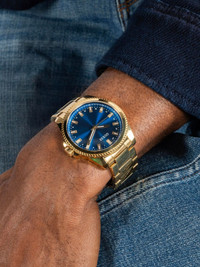 stainless steel battery 44mm Highlights - 44mm - Royal blue/gold-tone - Stainless steel - Round face - Geometric dial - Baton hands - Battery-operated movement - Fluted bezel - Screw-down crown - Adjustable link bracelet - Folding clasp - This item comes with a standard one-year warranty from the boutique. Imported Composition Mineral Glass 100%, stainless steel 100% SIZE & FIT Measurement DIAMETER 1.73 in(4.4 cm)